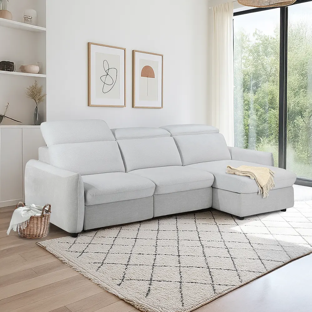 Le canapé d’angle Gabriel combine confort et praticité avec son angle réversible et ses deux assises motorisées avance/recul. Son tissu doux et moelleux « duveté et sweet » invite à la détente. Fonctionnel, il offre un grand coffre de 125L et un couchage d’appoint de 105x230 cm. Son atout principal : sa modularité. Complétez le avec le Cabriolet 360° assorti.